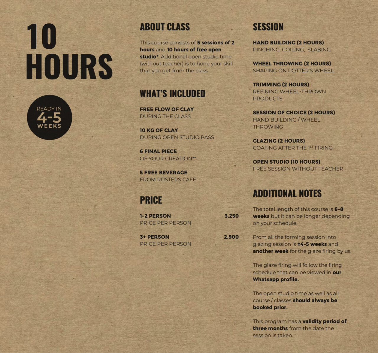 - 5 classes (5 × 1.5 hours), 10 pieces, 10 kg of clay — 1,900,000 IDR
