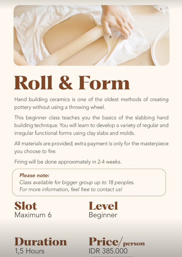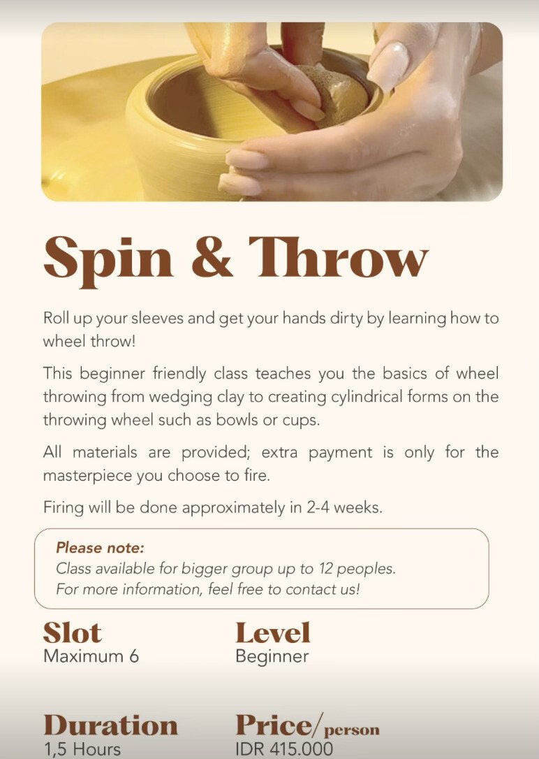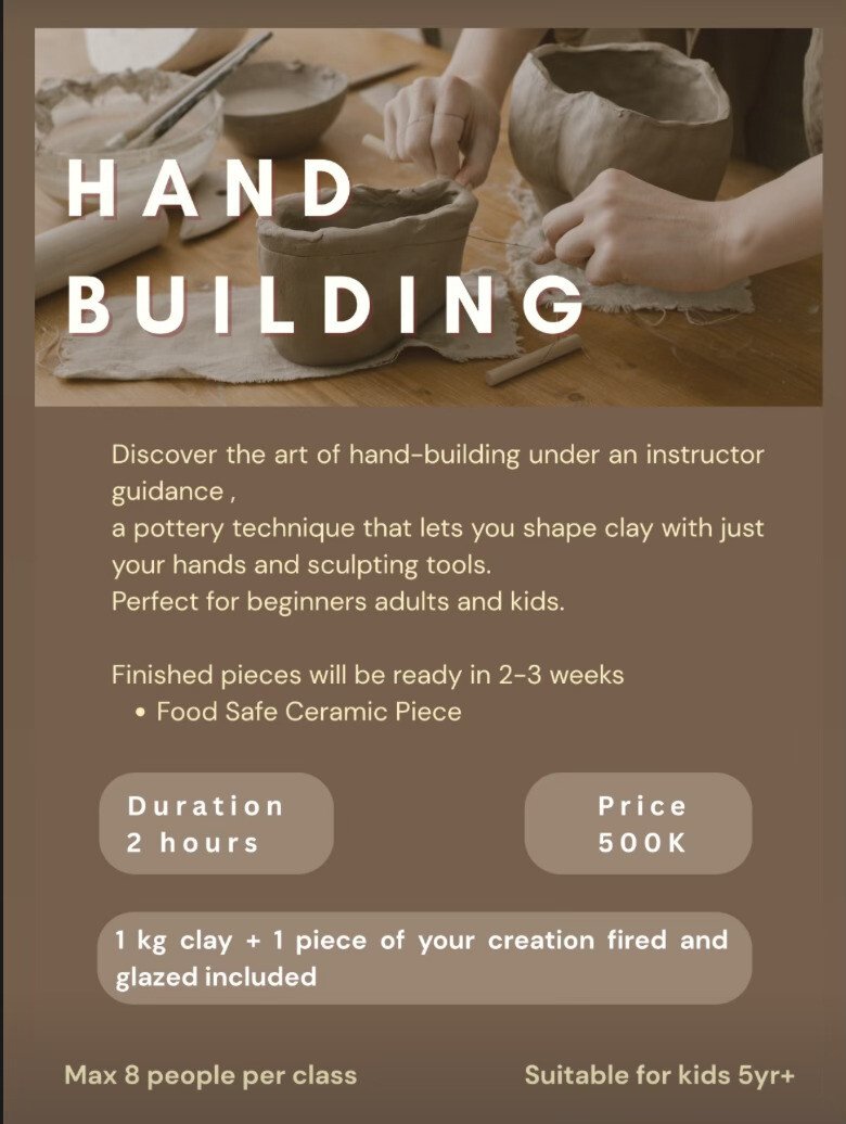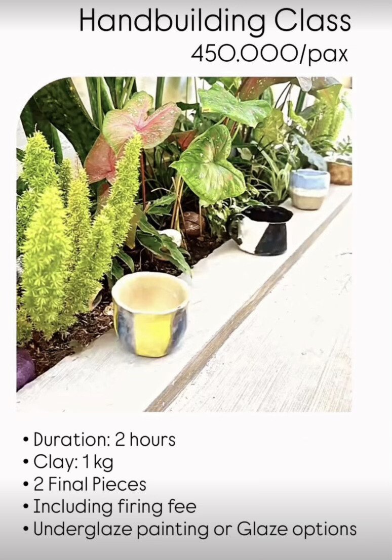- 1 class (1 hour). Includes all materials and one finished piece — 250,000 IDR