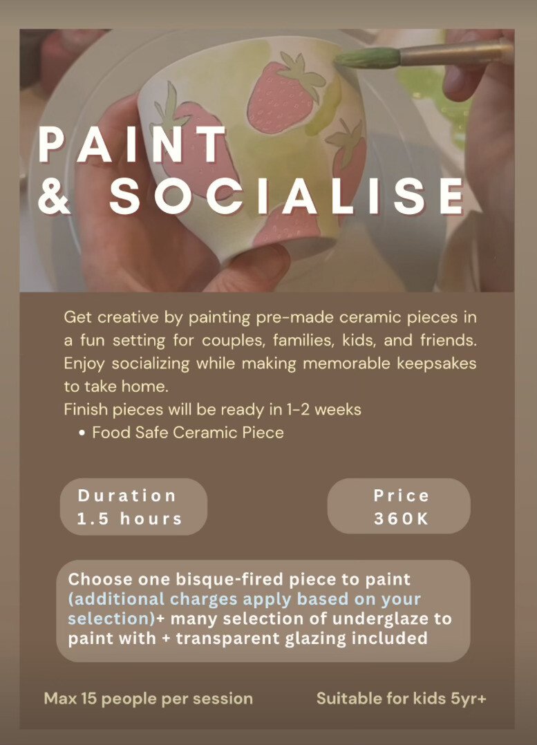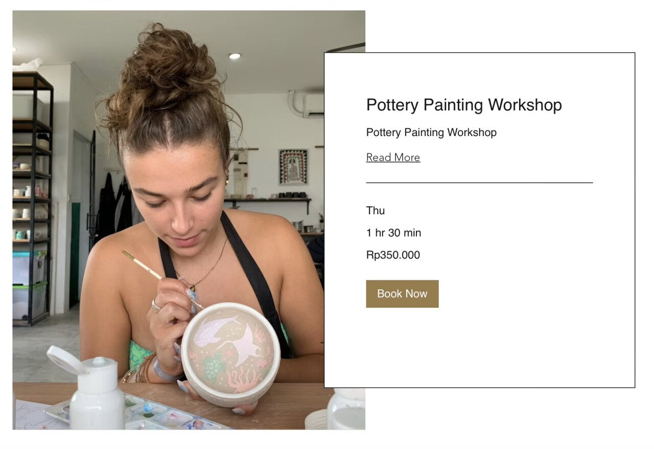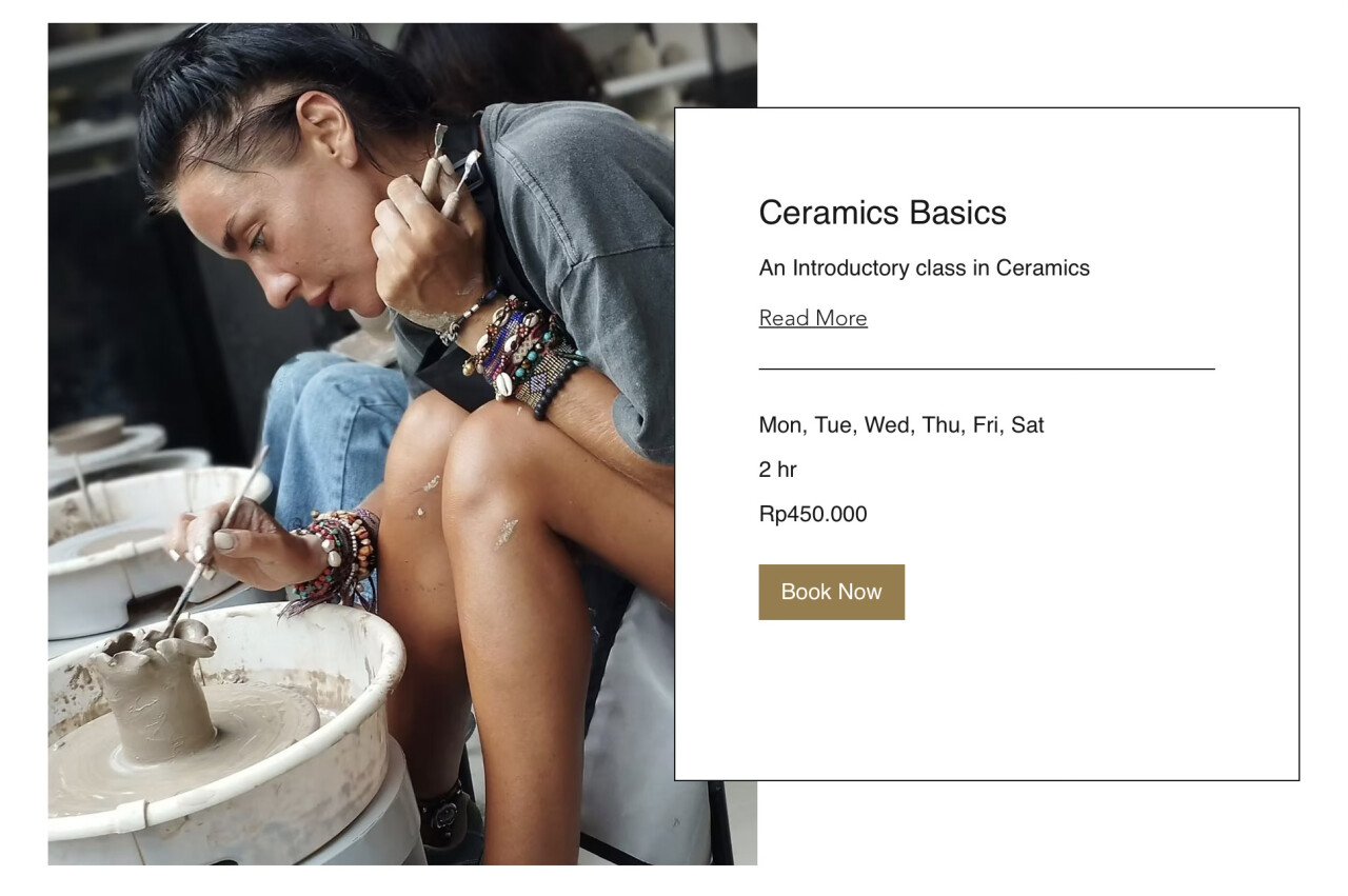 - 1 class (1 hour). Includes all materials and one finished piece — 250,000 IDR
