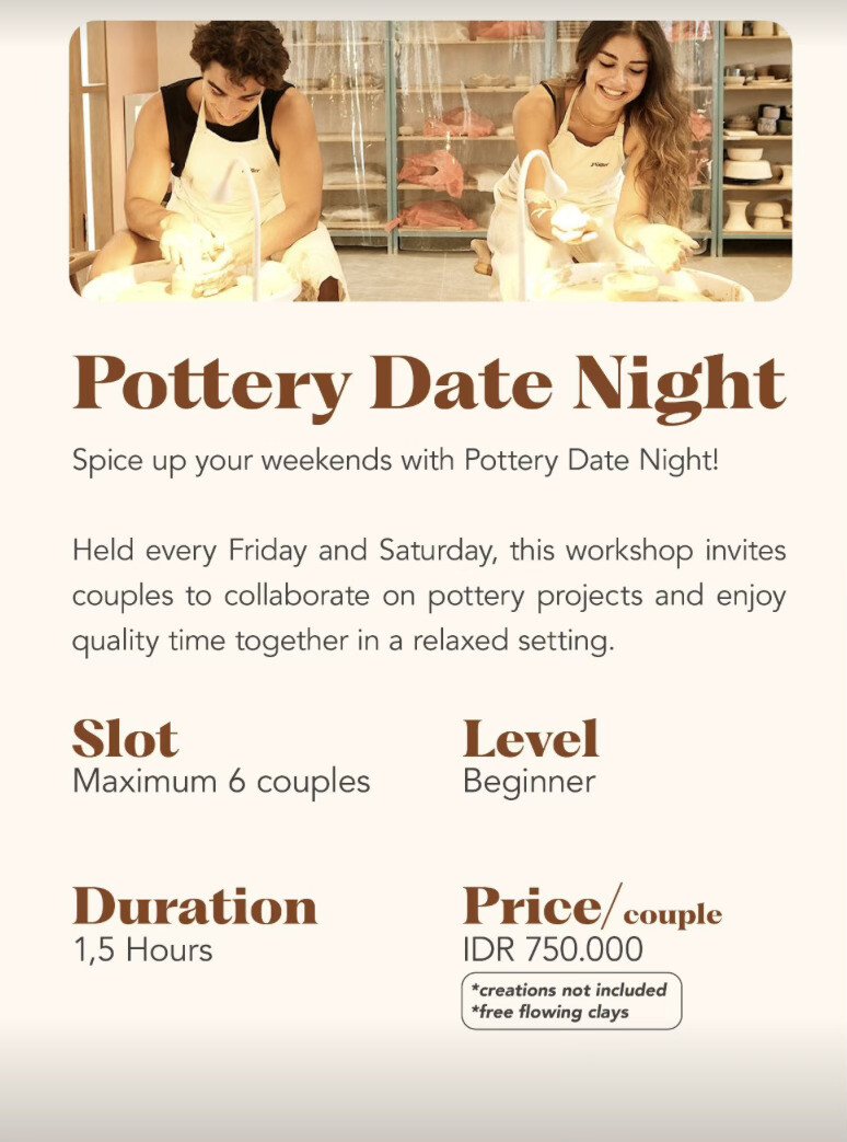 Something a bit different: there’s a package with a photoshoot. You’ll have three hours in the studio with no one else around — only the photographer capturing the most heartfelt moments of this date. Included: tea, coffee, four finished ceramic pieces, wheel throwing, and decorating. Price: 2,700,000 IDR.