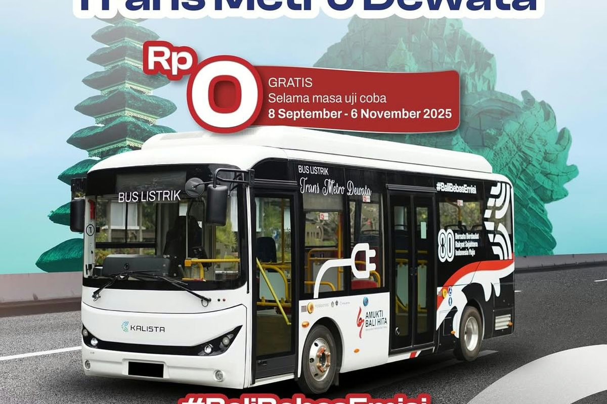 The route passes through key points in the island's tourist area — Ngurah Rai International Airport, Jimbaran, and Mumbul. During the testing period, rides are free, and payments via e-money or QRIS Tap are purely demonstrative, meaning no money is deducted from the account. Electric buses run daily from 5:00 AM to 7:00 PM.