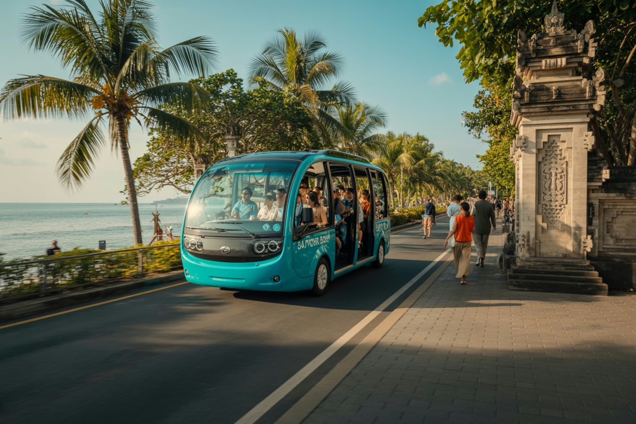 Since August 2025, Sanur has its own electric bus shuttle. The shuttles operate daily from 6:00 AM to 10:00 PM. Each electric bus is designed for 10–12 passengers. The route starts at Sanur Tourism Junior High School (SMP) stop and passes through key Sanur stops — Sindhu Market, Icon Mall, SPKLU charging station, and ends at the Mertasari Beach parking lot.