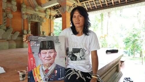 One of the most talked-about exhibits is a portrait of President Prabowo Subianto. Artist Nyoman Antara brought it to the exhibition: it’s not an oil or acrylic painting but a collage made from colorful fragments of old foreign magazines.