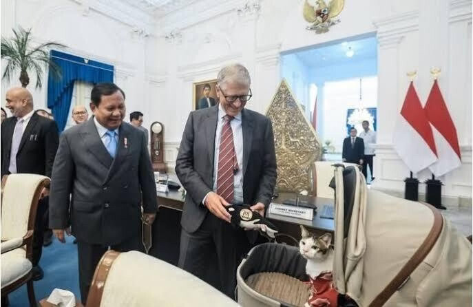 The billionaire personally greeted Bobby as he rested in his famous stroller and presented him with an unusual souvenir — a plush black-and-white orca. The video of the meeting went viral instantly, and Indonesian social media users joked that the creator of Windows is now providing tech support to Indonesia’s ‘first cat’.