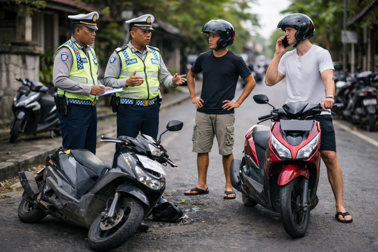 Traffic accidents happen frequently in Bali, and people usually try to resolve the situation immediately on the spot by agreeing on repairs and closing the matter without unnecessary formalities.