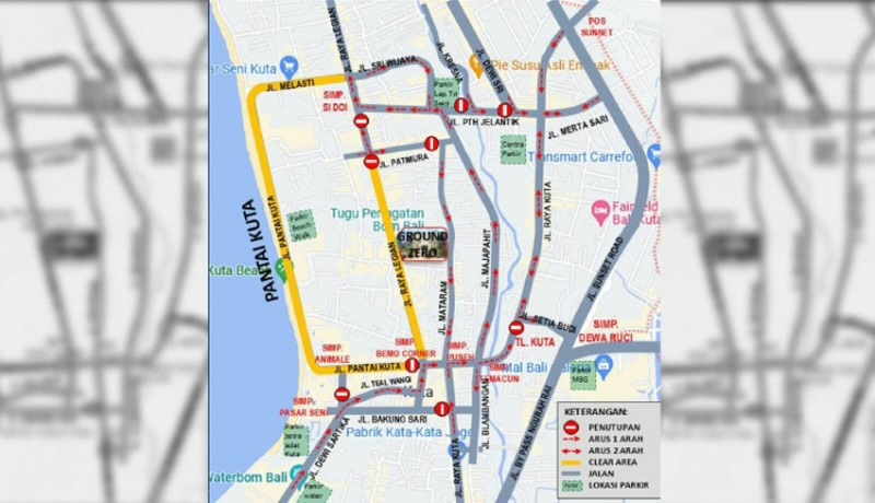 - Simpang Patih Jelantik–Legian (Si Doi): traffic towards Ground Zero is closed, directing vehicles to Jl. Legian Kaja, then to Jl. Raya Seminyak.
