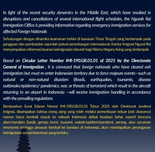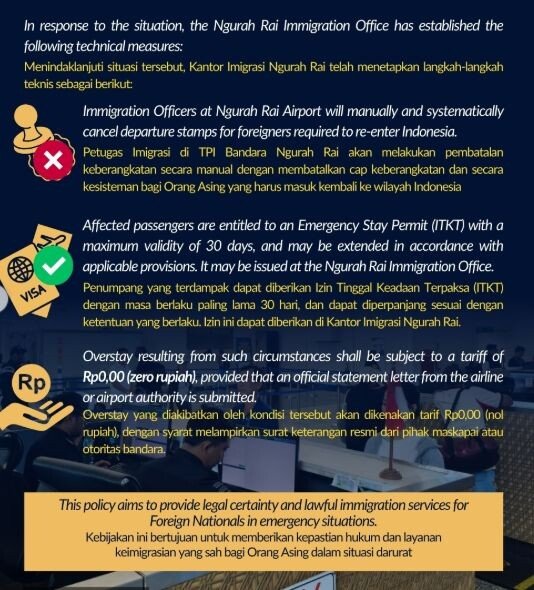 The Directorate General of Immigration has issued separate guidance for such flight disruptions (letter No. IMI-GR.01.01-133 dated 1 March 2026): if an overstay occurred specifically due to a flight cancellation/rescheduling and the airspace closure, the fine may be reduced to 0 rupiah—provided the passenger has confirmation from the airline or the airport authority. The same guidance states that, in such cases, a temporary stay permit due to force majeure may be issued for up to 30 days (with the option to extend it if the departure problem continues). It also sets out a typical scenario for those whose flight was cancelled after passing border control.