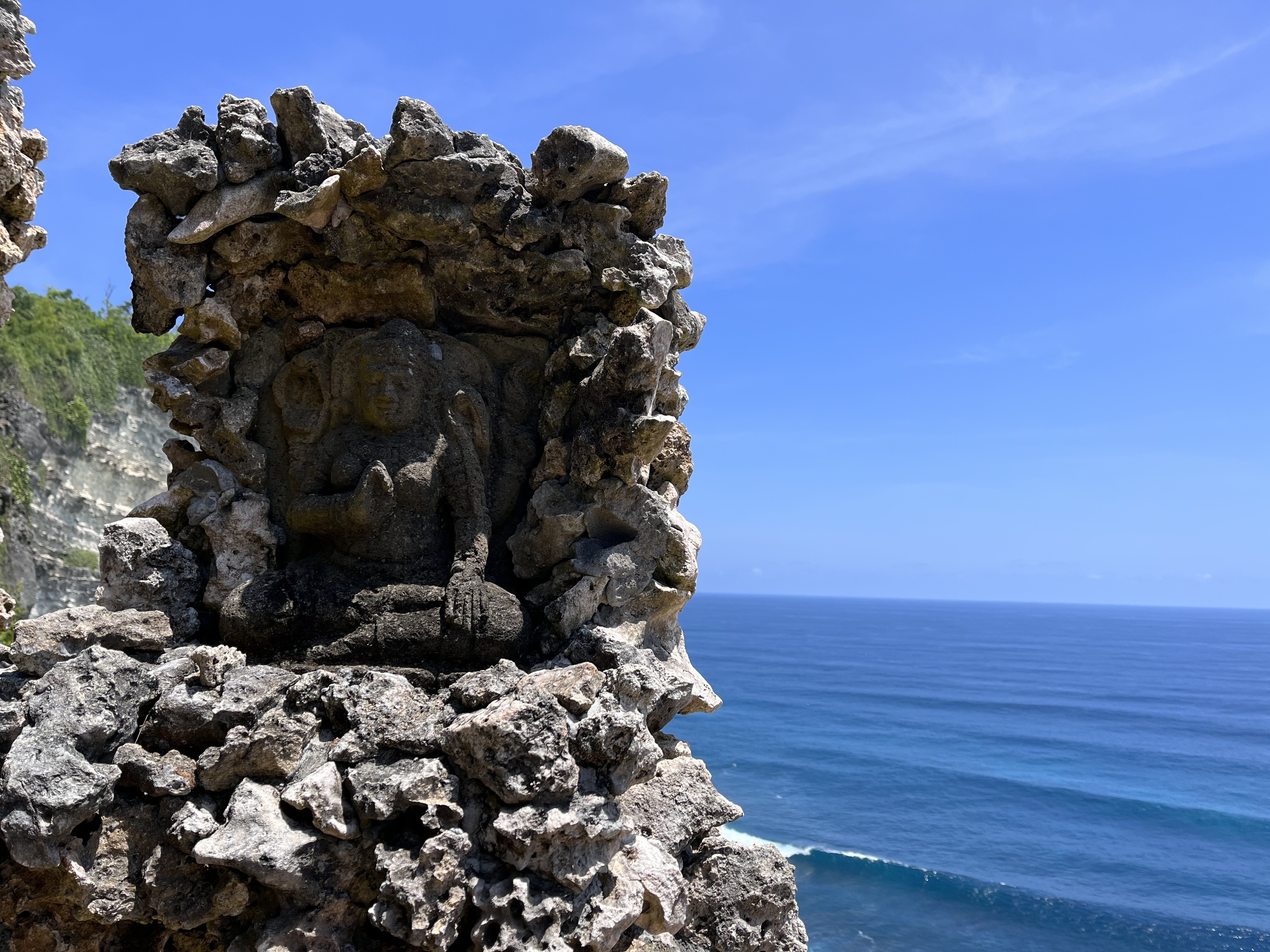 After we eat, we can continue our journey. Everything is close here, so we don't have to travel far. Let's go to Uluwatu Temple. The temple itself is located on a steep cliff, over 90 meters high. It is believed to protect the island from evil sea demons.