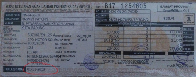 If you’ve purchased a motorbike from a local owner in Bali, at some point you’ll need to renew the annual road tax. Riding with expired tax can lead to issues with traffic police, even though in practice enforcement is inconsistent.