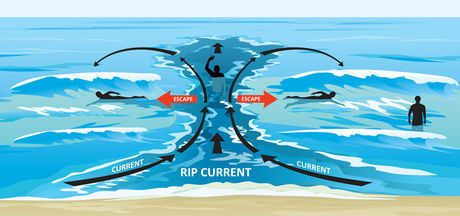 When large waves break against the shore, they create foam that pushes the swimmer back to land. Conversely, a rip current is a narrow but powerful stream that carries you out to the ocean. It's hard to recognize and nearly impossible to swim against, even on a surfboard.