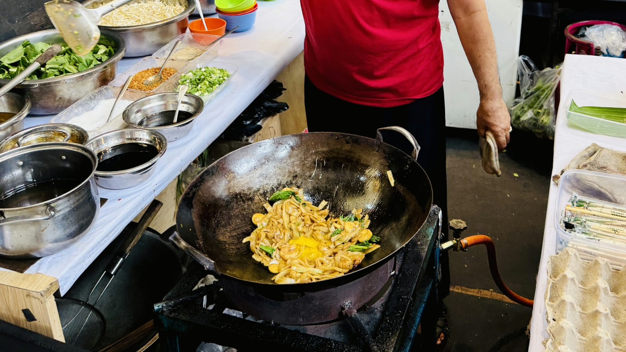 And here comes the queue. A man of years, together with his son, fries noodles in a large wok. Out of the four dishes he has on display, I only recognize nasi goreng. But we won't try that. We'll get kway teow goreng. It's wide rice noodles with vegetables, shrimp, and chicken. Very similar to Thai pad thai. The price is steep for those used to local food being cheap — 60k per portion. But it's worth it. The noodles are good, and the shrimp seem quite fresh. It's slightly greasy, but if you drizzle lemon juice over it, it's delicious. The chef is from Jakarta, the dish is Javanese.