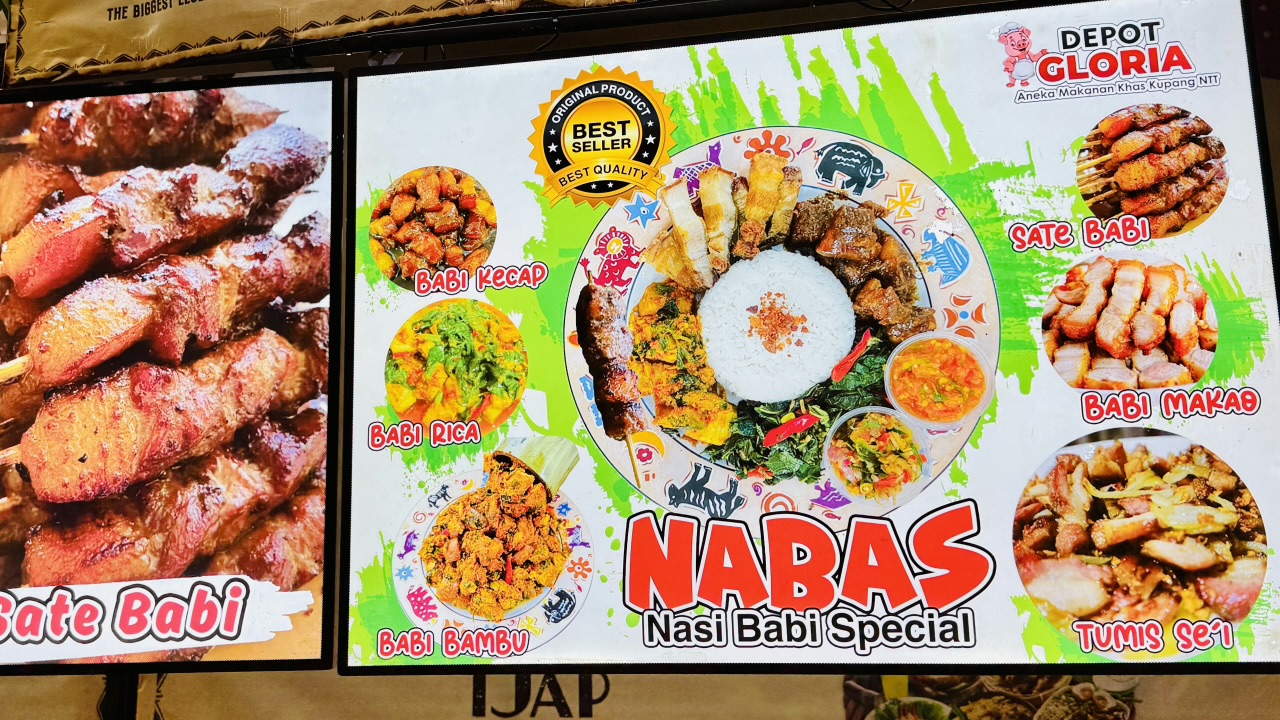 On the way to the durian corner, seen from afar, stands a stall with pork. Here, Balinese satay and a couple of other dishes are familiar. Surprisingly, they were brought from Kupang, in East Timor... but isn't Indonesia a Muslim country? A mystery...