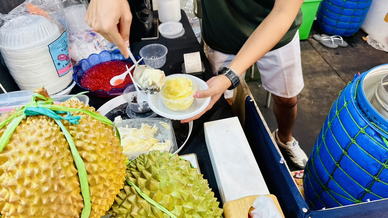 The last thing we have room for is ice cream from Sulawesi. On the whole, nothing extraordinary. Three kinds of fruit ice — avocado, coconut, durian. Each portion is topped with chocolate chips, jelly balls that resemble red caviar, and sliced bread — classic.