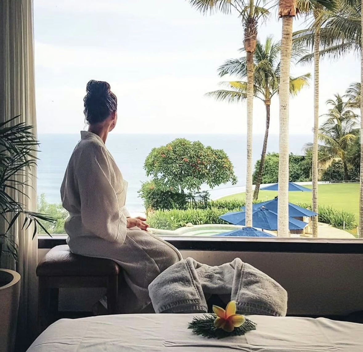 Treatments take place in open treatment rooms overlooking tropical greenery, and the atmosphere is peaceful and secluded.