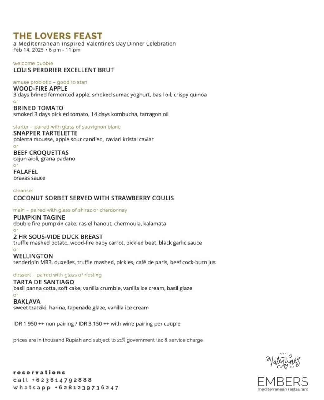 Embers is a restaurant in Ubud known for its Mediterranean-style cuisine. For Valentine’s Day, they’ve prepared a special dinner featuring seasonal ingredients and an atmosphere that invites you to slow down and enjoy the evening.