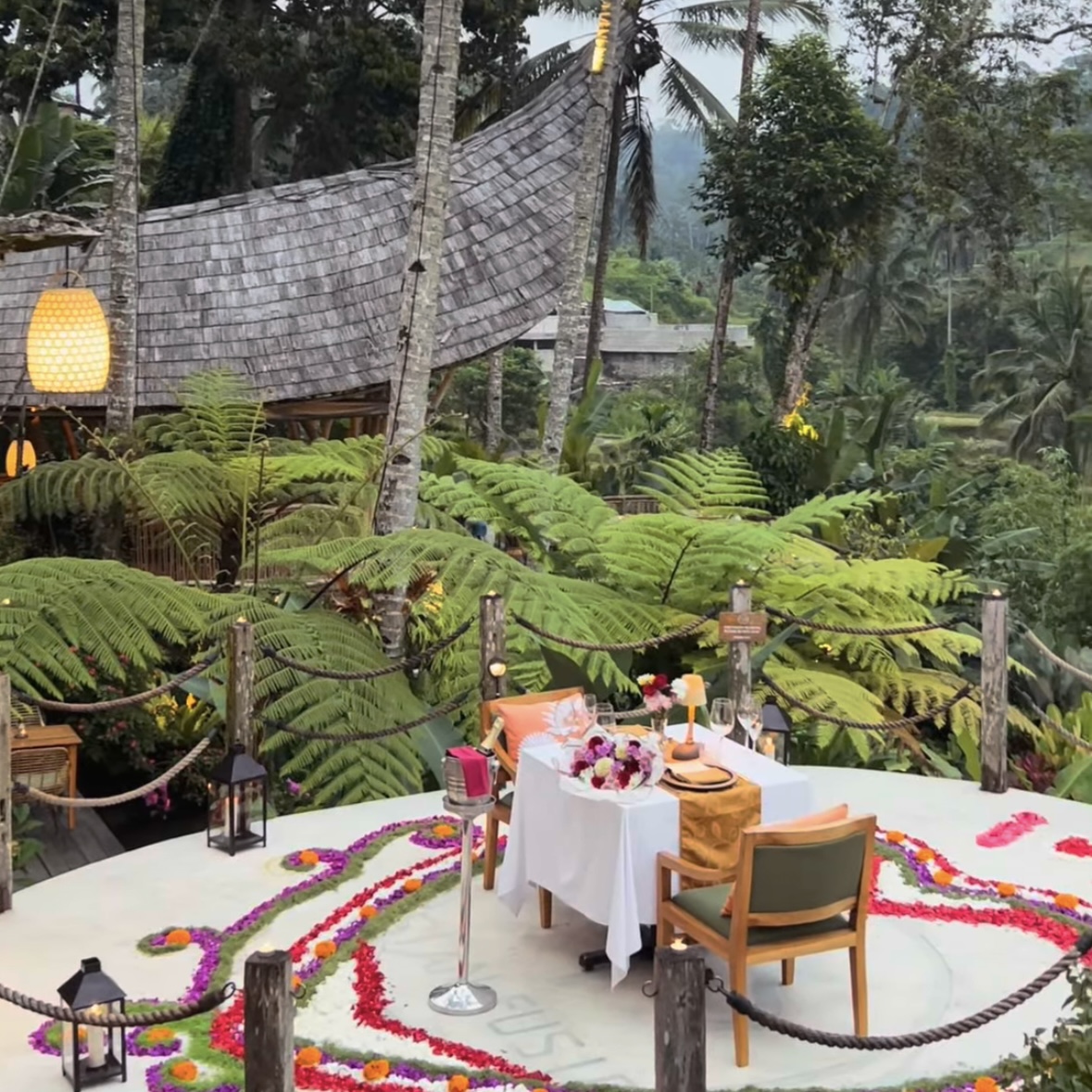 In Bali there are many beautiful options — dinner on a terrace surrounded by greenery in Ubud, a table by the ocean with the sound of waves, or unique venues with soft lighting and an intimate atmosphere.