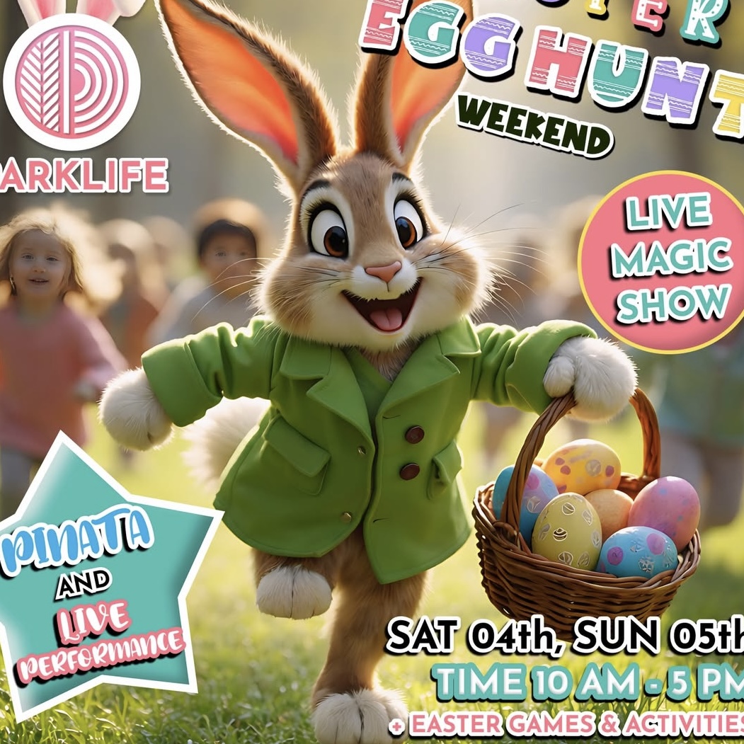 The programme includes an Easter egg hunt, piñatas, face painting, close-up magic, performances, and a special guest. There will also be a family photo area.
