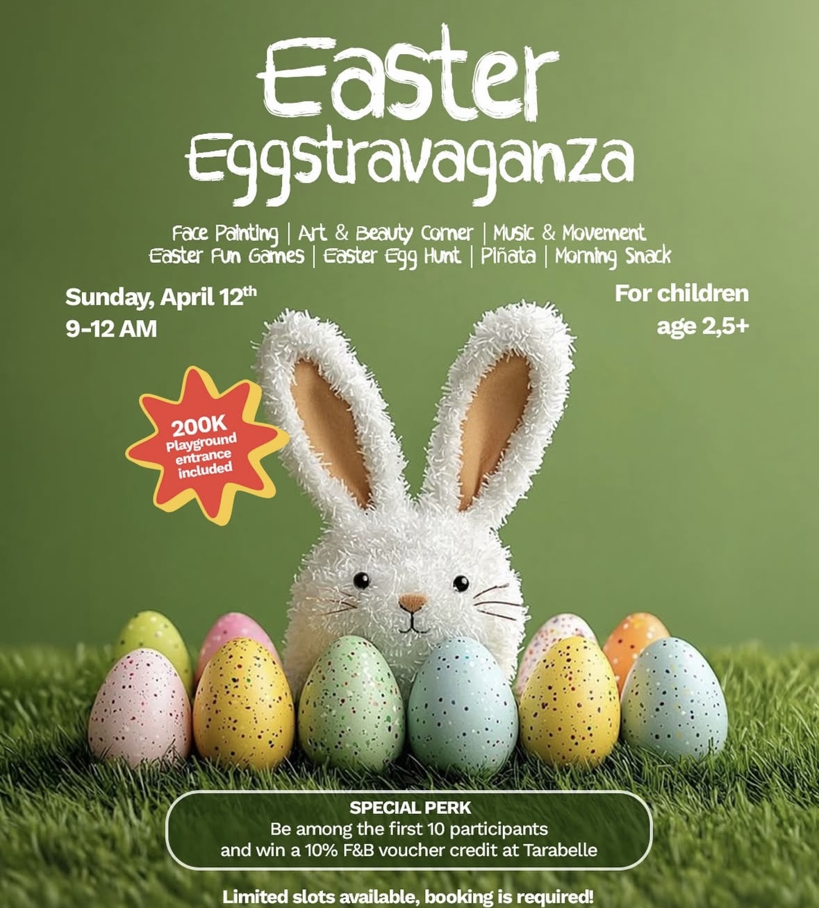 The programme includes face painting, an art area and beauty corner, music and movement, Easter games, an egg hunt, a piñata, and a light snack.