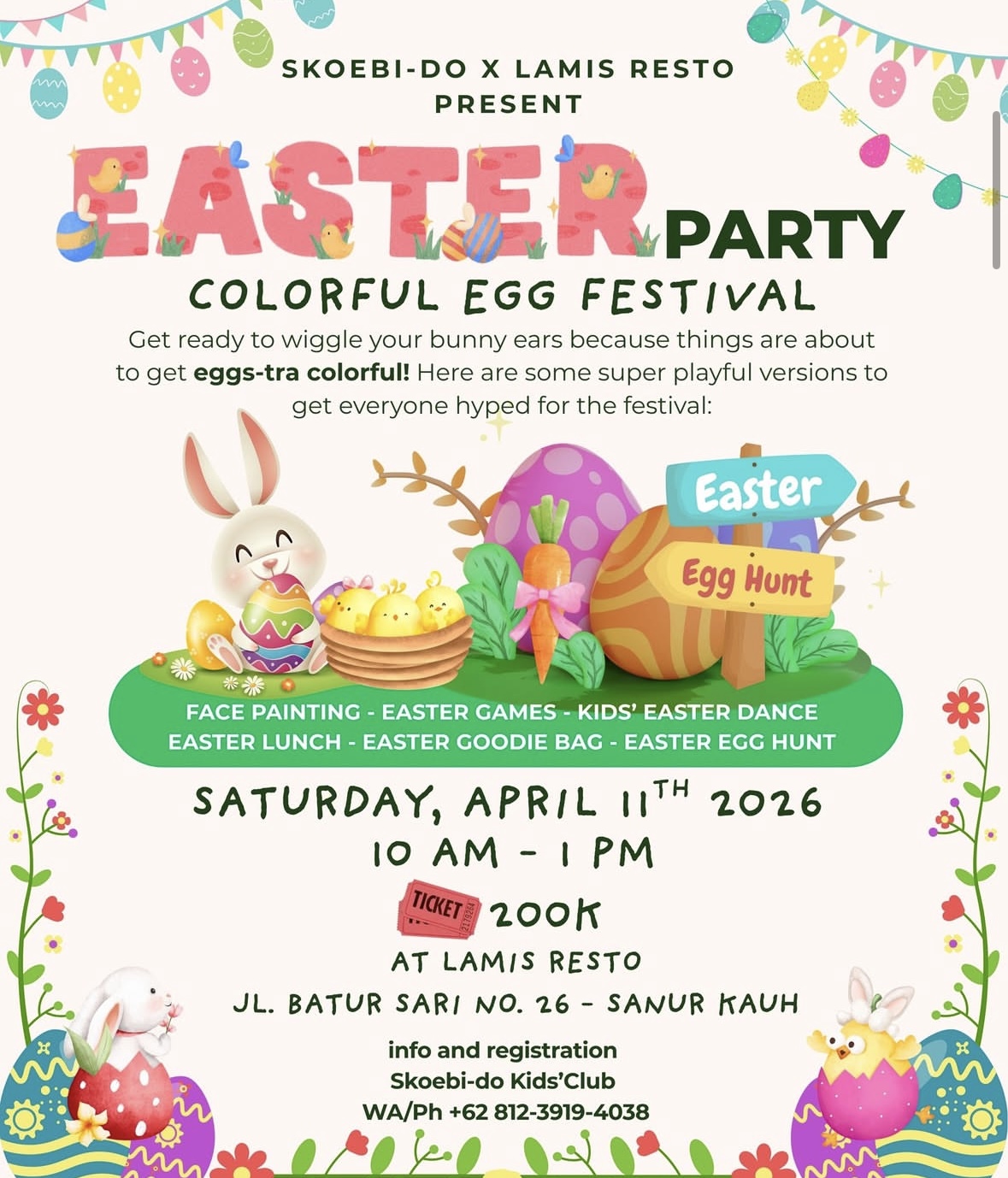 Join the Colorful Egg Festival at Lamis Resto—an excellent Saturday morning for children with dancing, face painting, games, an Easter lunch, and a big egg hunt.